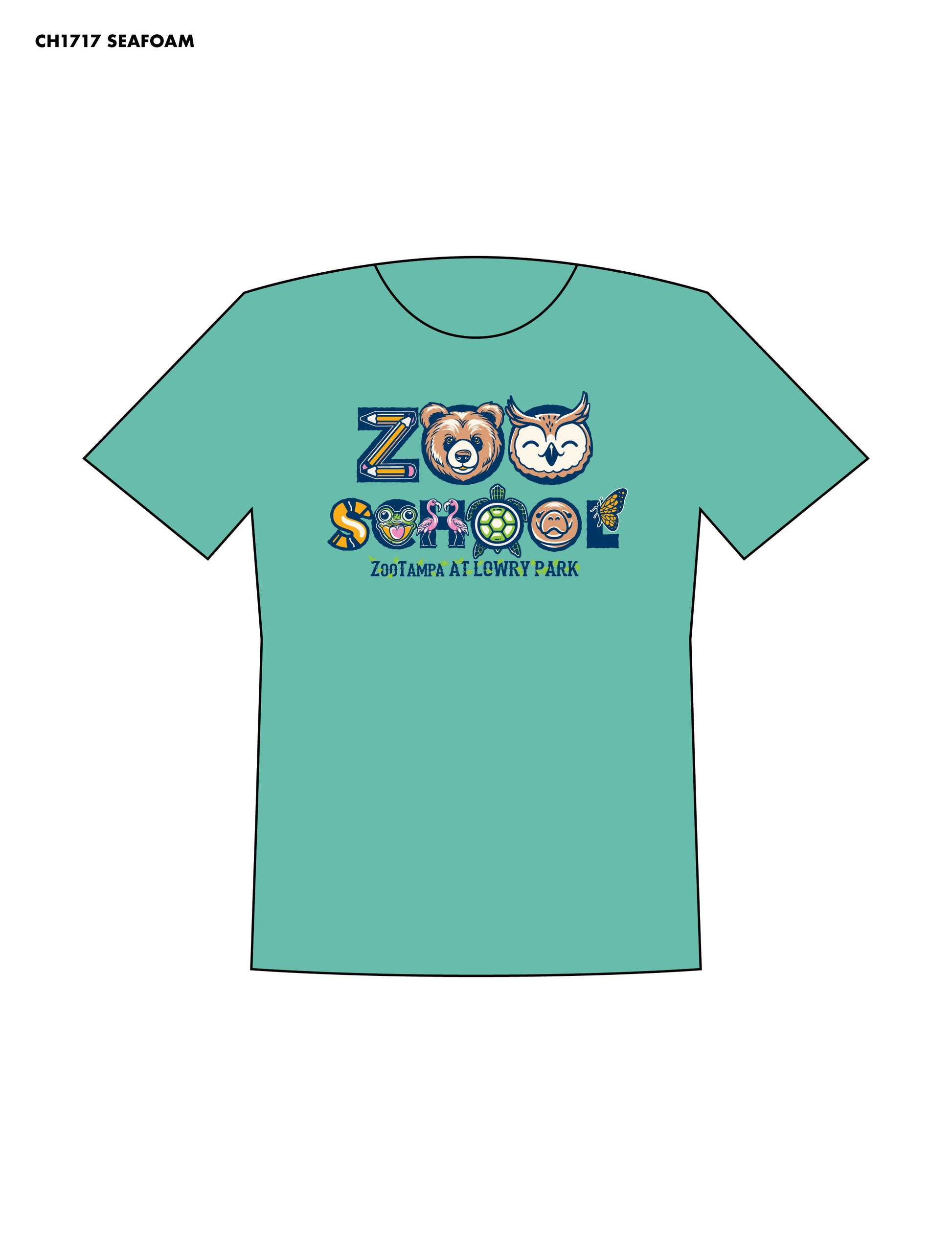 Adult Comfort Color Zoo School tee in seafoam featuring all classroom animals. Available in SM, MD, LG, XL, 2XL & 3XL.